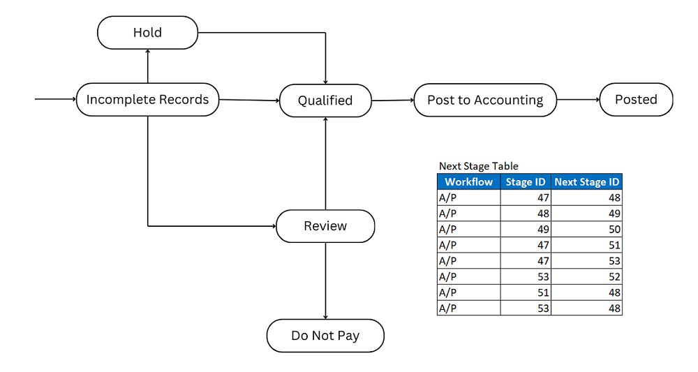 Triggers can be used to switch stages based on certain rules hard coded at trigger level. Below is a sample trigger for an A/P Workflow table named Invoice: